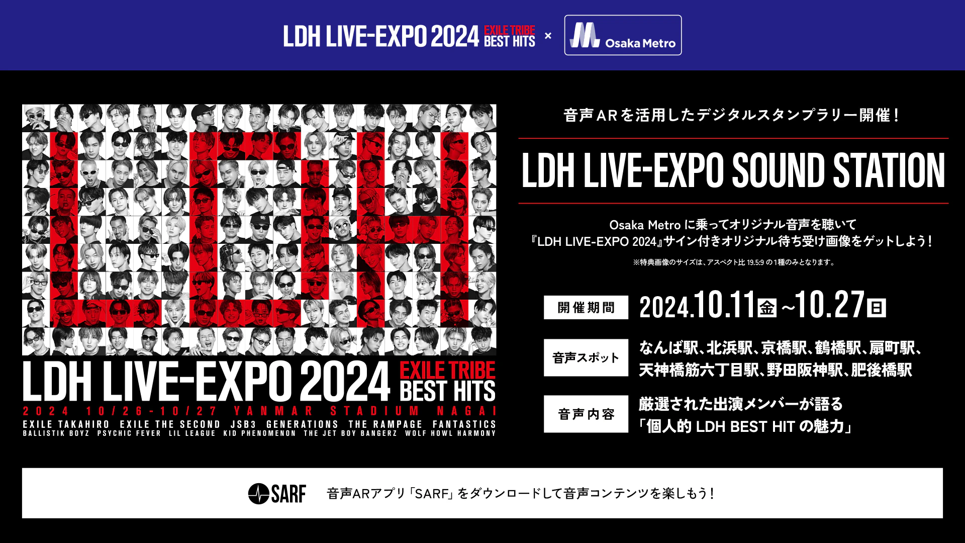 10月26日(土)〜27日(日)にヤンマースタジアム長居で開催されるEXILE TRIBEのヒット曲を集めたメンバープロデュースのコンセプトライブ『LDH LIVE-EXPO2024』との連動企画です。Osaka Metroの8駅に設置された音声ARスポットを、音声ARアプリ「SARF」で巡ります。